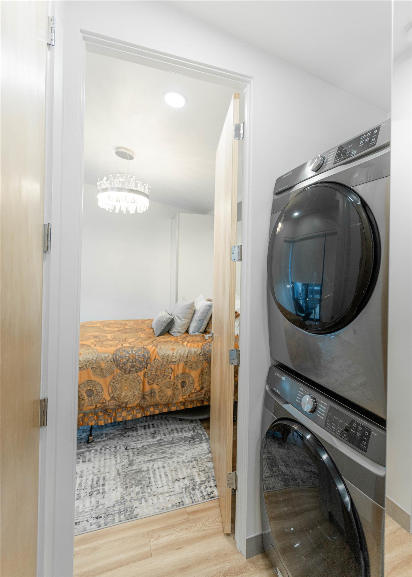 Tucked neatly between the kitchen and bedroom, you’ll find a full size washer and dryer, complete with all your laundry essentials, conveniently available to you after a day of play outdoors.