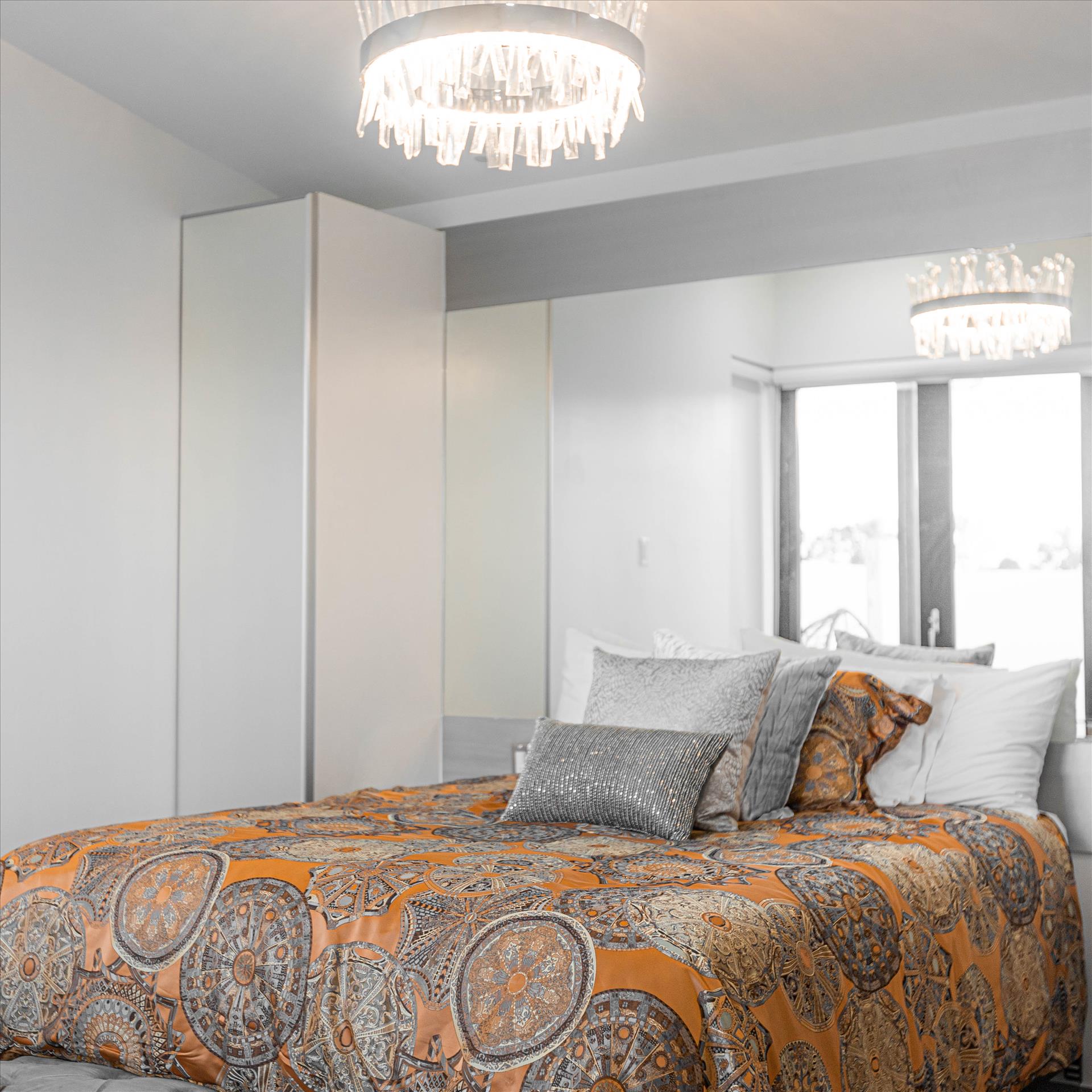Completely relax in the two beautifully designed bedrooms, each with a roomy queen bed. Both stunning bedrooms boast high-end luxury linens, extra pillows and blankets for complete comfort, their own private bathrooms, plenty of closet space, big open window walls, mirrors and gorgeous chandeliers for an open and upscale feel.
