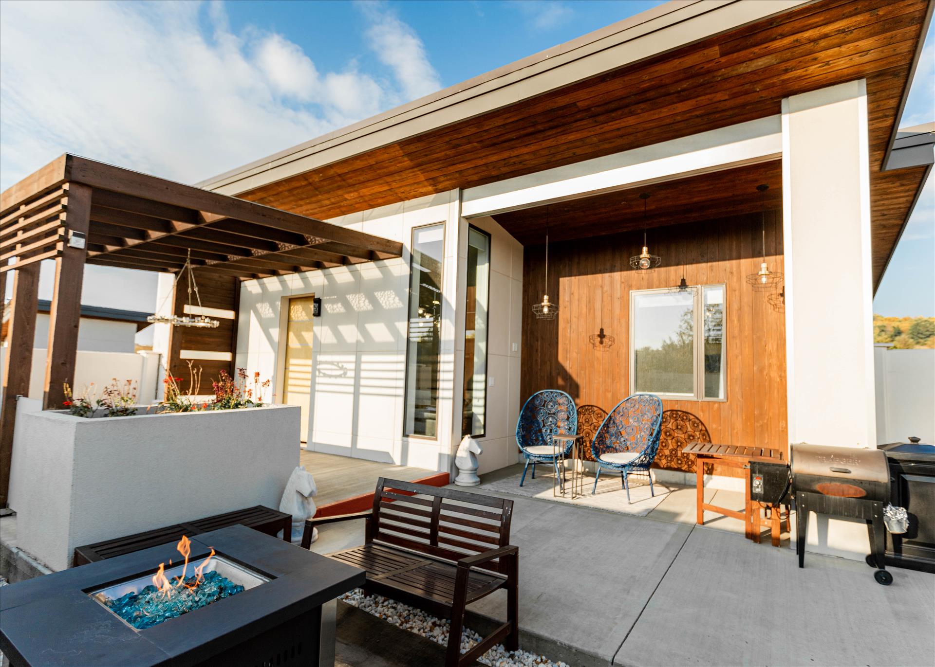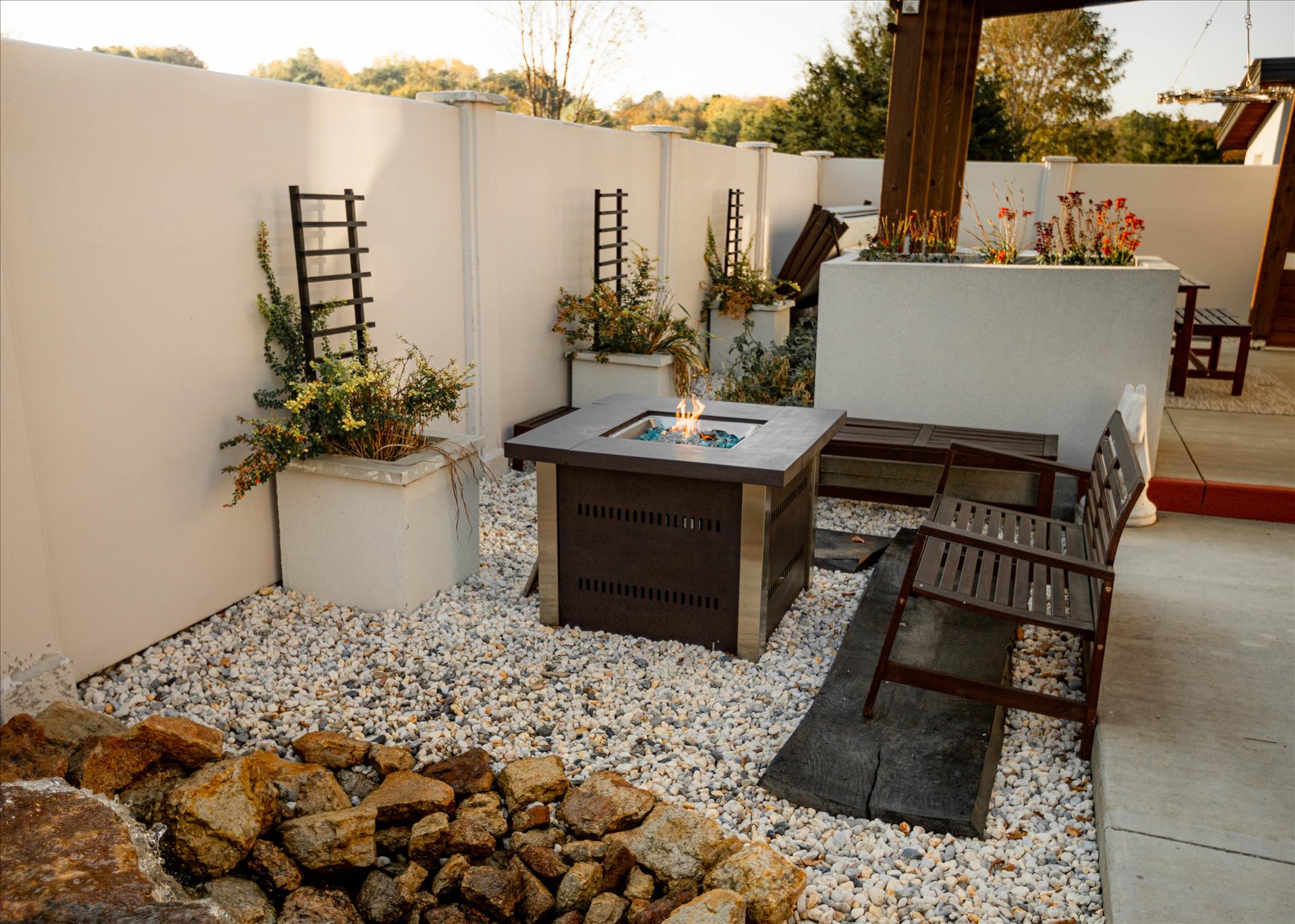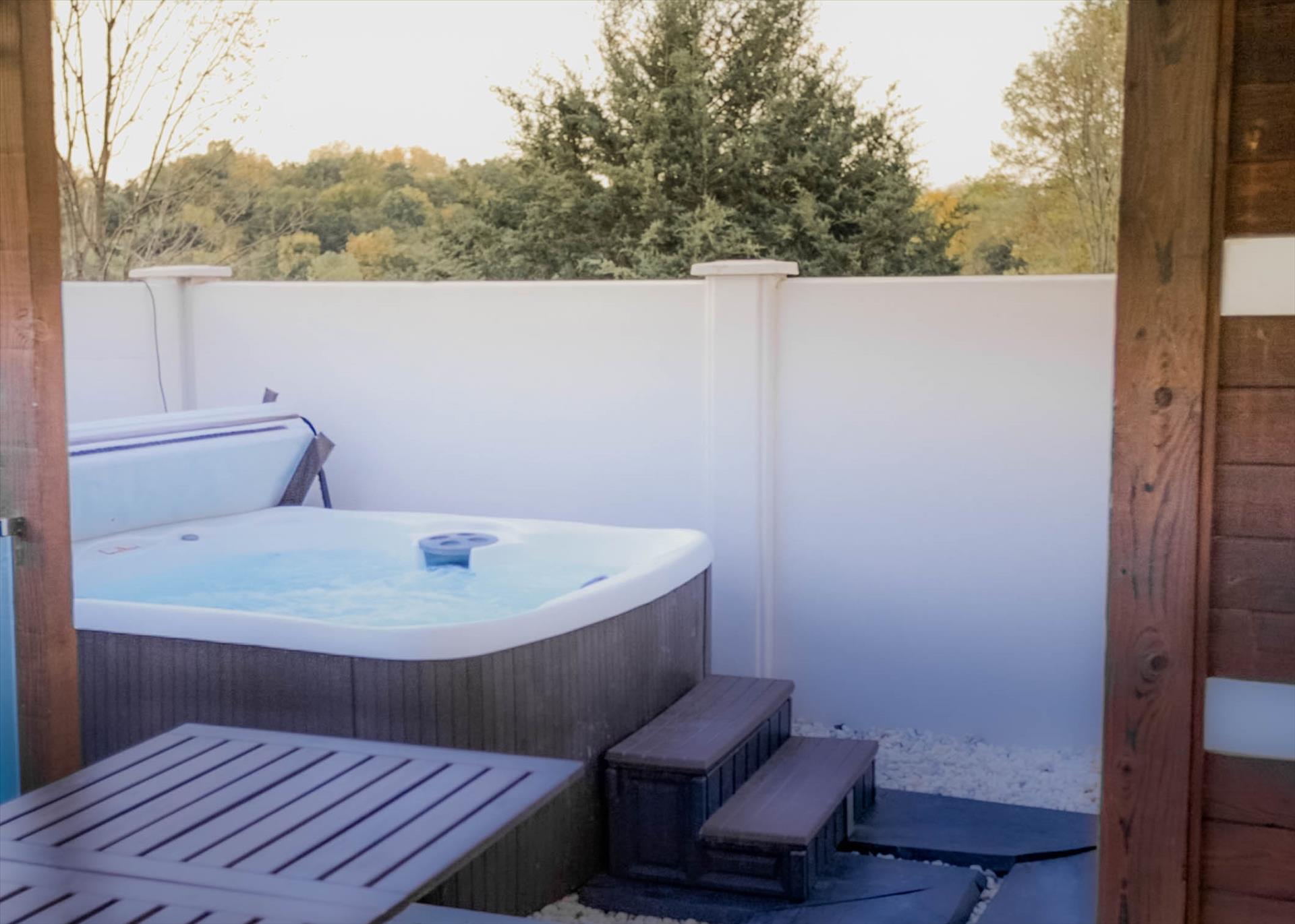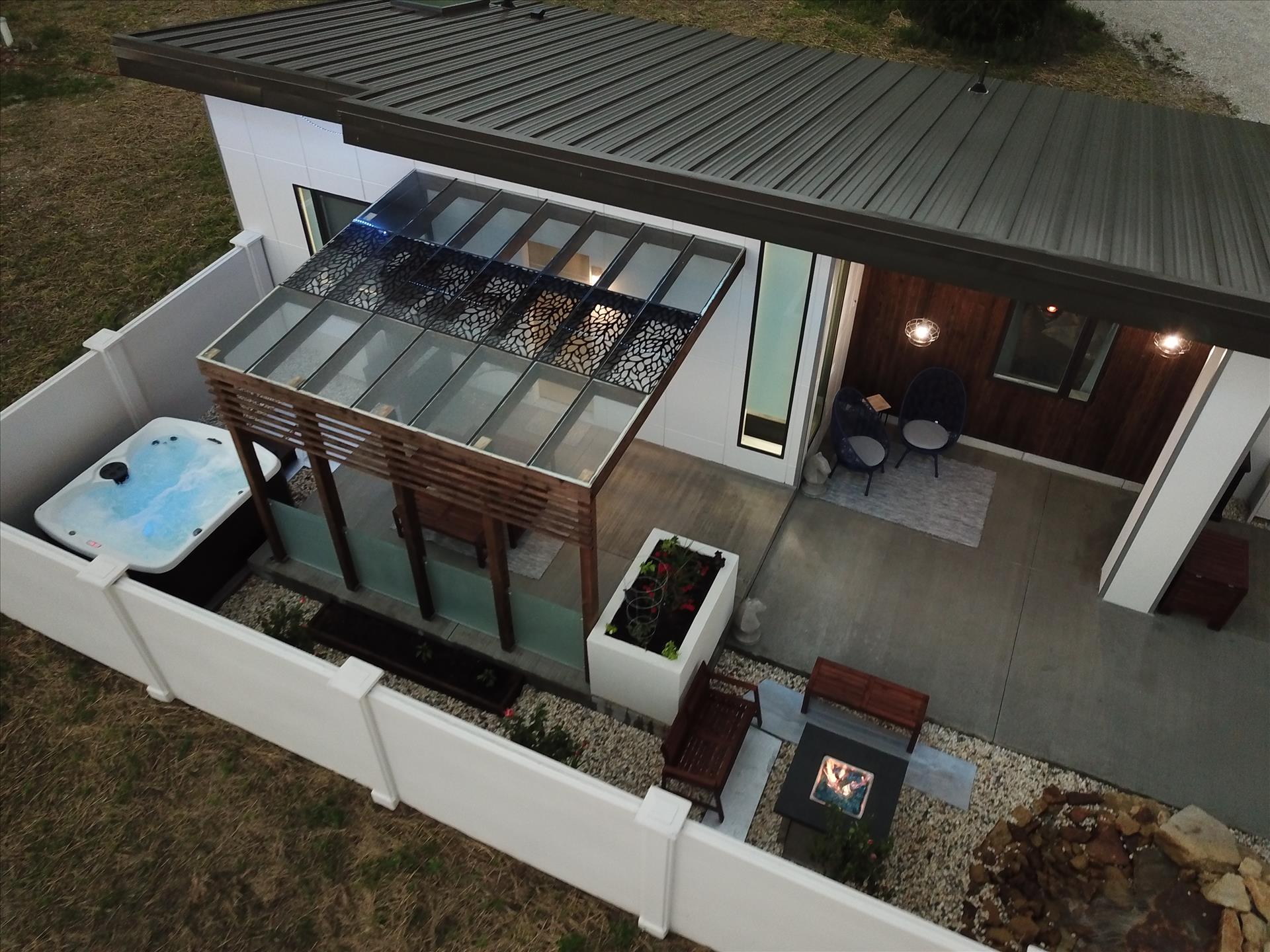 The courtyard is designed so each guest can grill, entertain, relax and enjoy the firepit, stunning waterfall, and private hot tub in their own space with complete privacy.