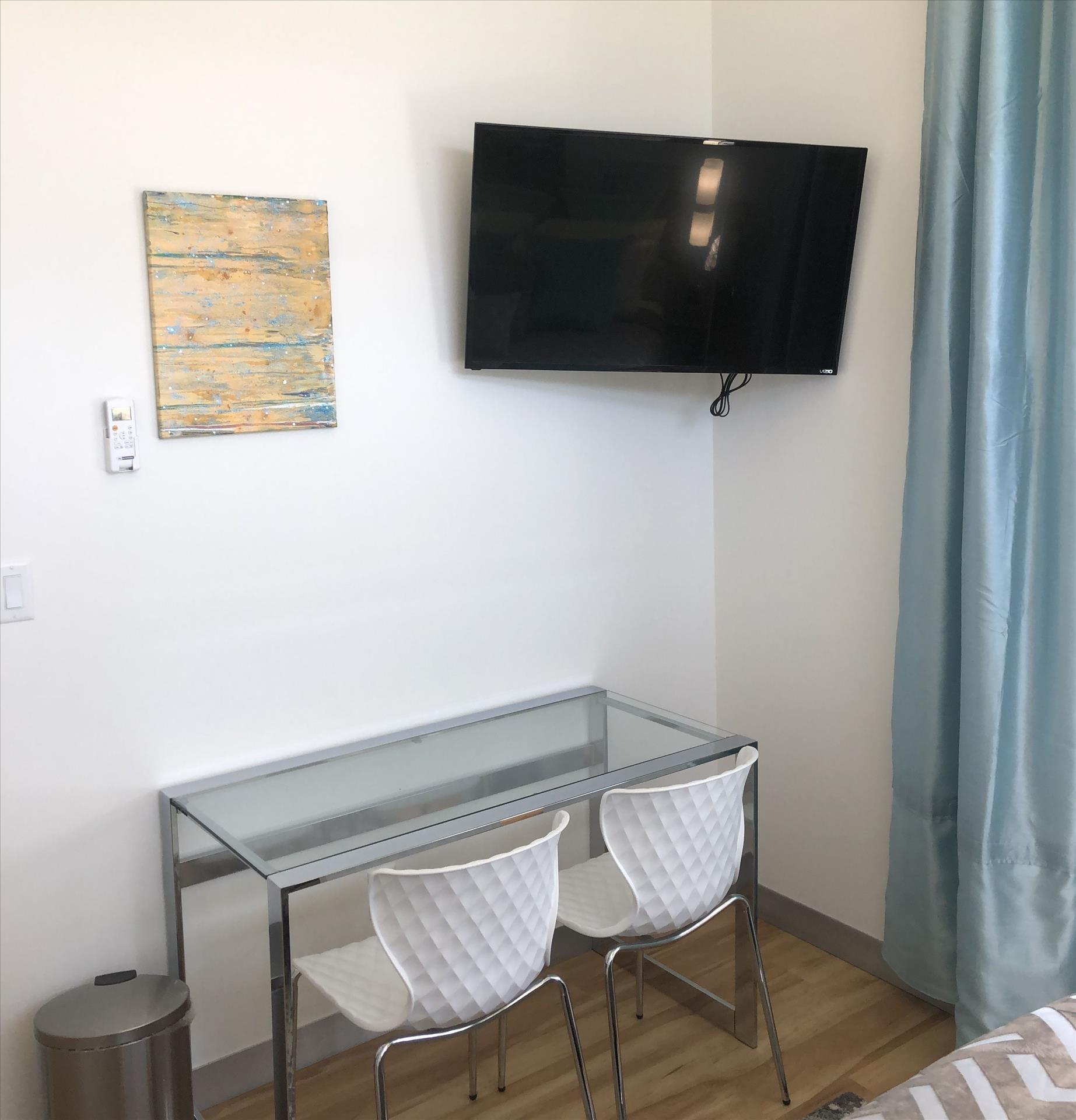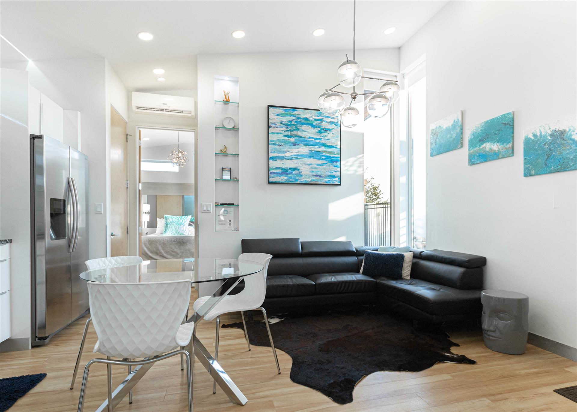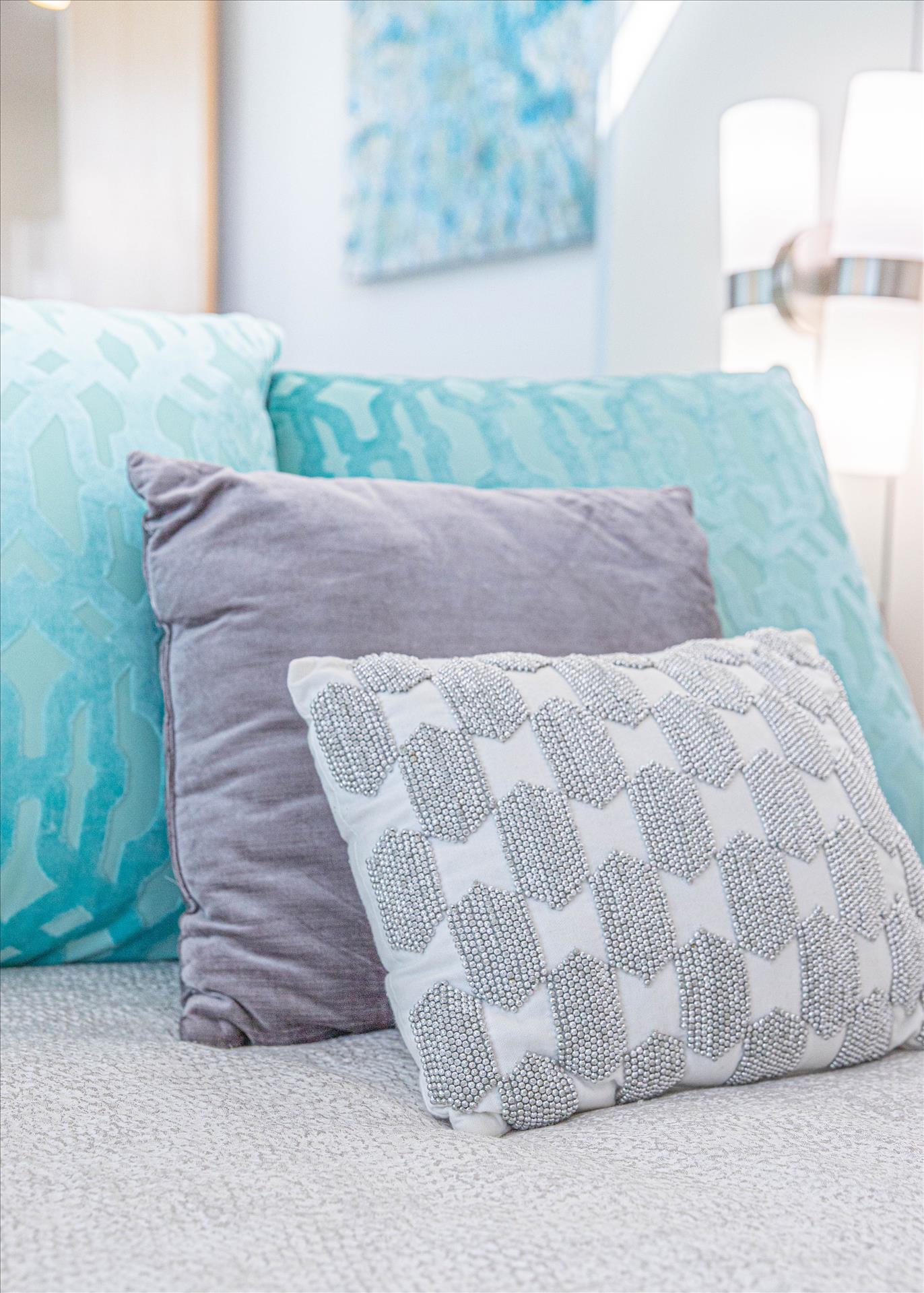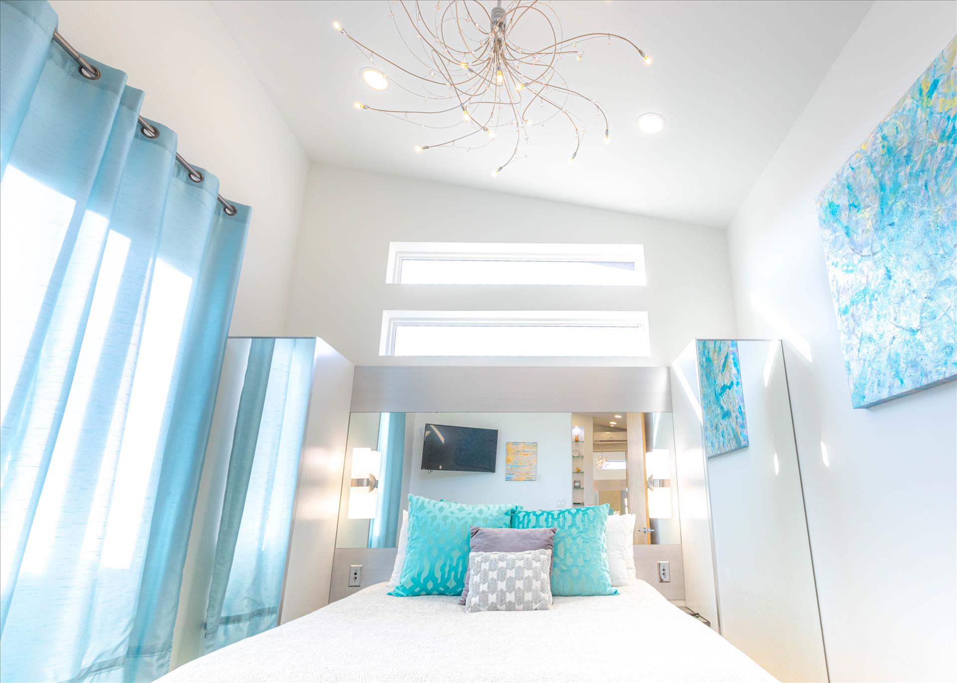 Completely relax in the two beautifully designed bedrooms, each with a roomy queen bed. Both stunning bedrooms boast high-end luxury linens, extra pillows and blankets for complete comfort, their own private bathrooms, plenty of closet space, big open window walls, mirrors and gorgeous chandeliers for an open and upscale feel.