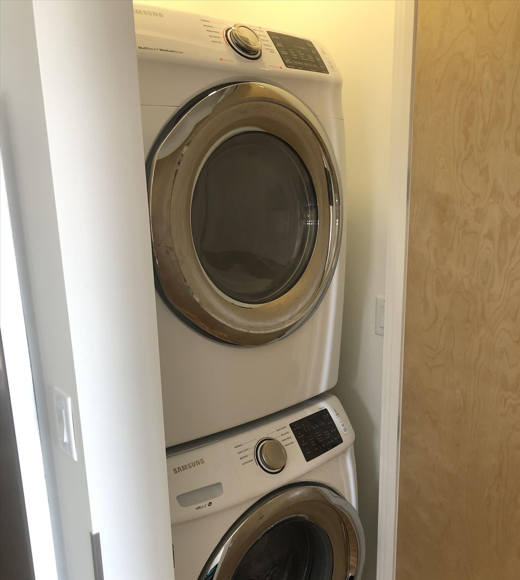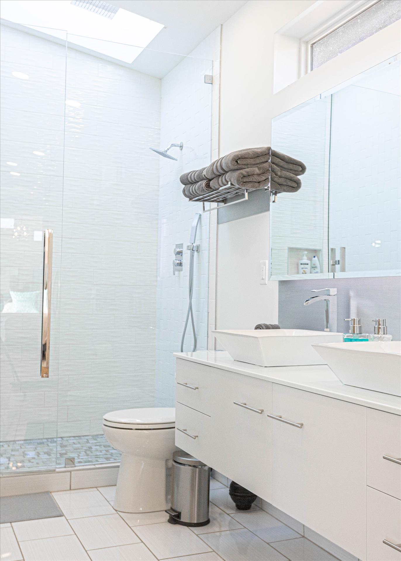 There's plenty of space to refresh and recharge in the spacious and sleek modern bathroom. Feel like royalty when you step foot onto the mosaic tiles of the European style shower. The vaulted ceiling and skylight, paired with a relaxing rainfall showerhead, ensures you leave the experience feeling invigorated and fresh. Fluffy towels, blow dryer, and shower toiletries for villa use will be provided so you can get ready for an exciting day of adventure at the lake or at one of the many trails perfect for hiking and biking. Guests will also enjoy a full size washer and dryer complete with all your laundry essentials.